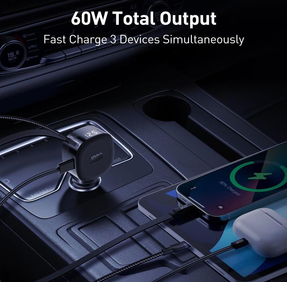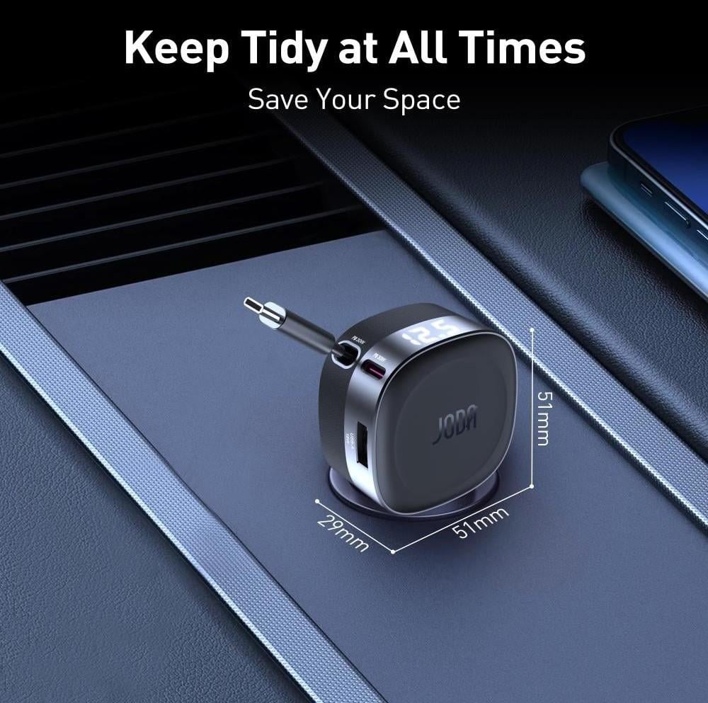 جودا -شاحن سيارة كار فليكس 60 واط مع كابل مدمج بمنفذين USB-C و USB-A - أسود